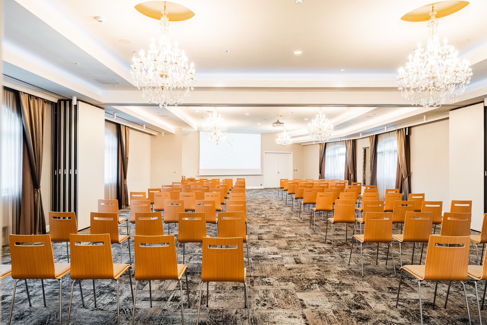 - Eingebauter Datenprojektor und eine ausreichend große Leinwand (6 x 4 m) für beide Säle.