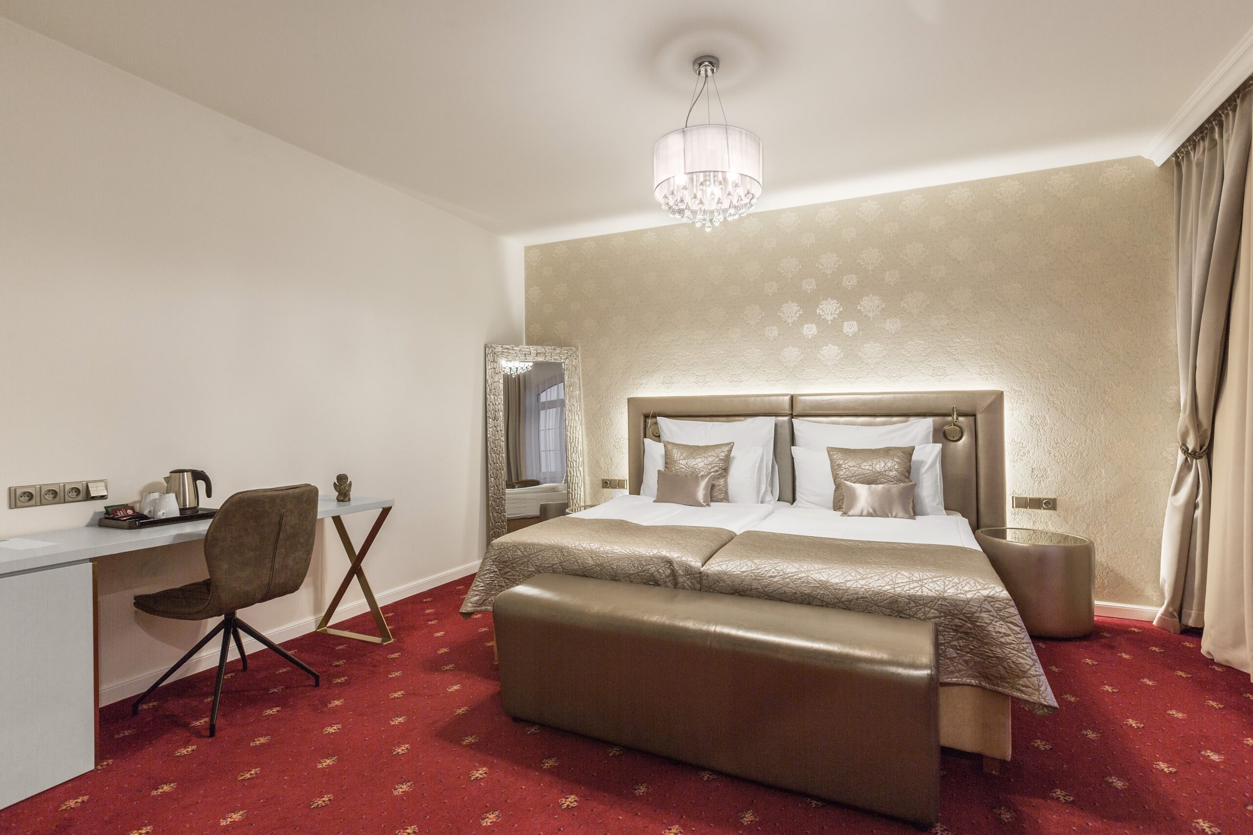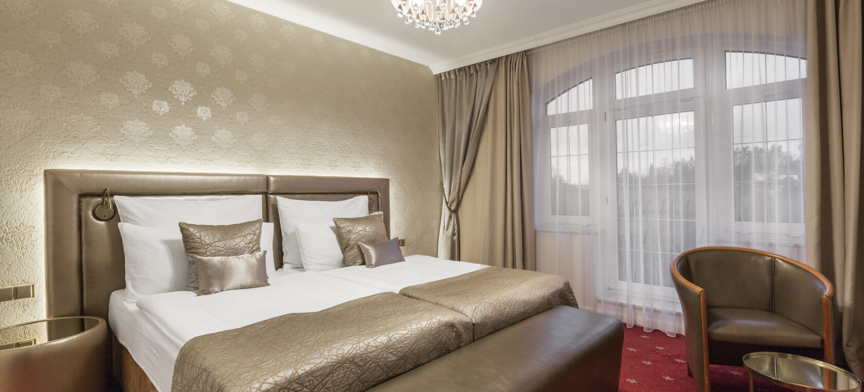 Die Zimmer Deluxe**** bieten komfortable Unterkünfte, Blick auf den Garten und den Wellnessbereich. Sie befinden sich im 0. bis 5. Stock mit Aufzug. Drei der Zimmer sind barrierefrei. Zwei können mit einem mobilen Bett ausgestattet werden.
