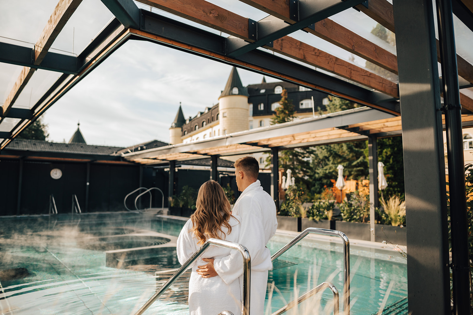 Das Thermalfreibad mit Whirlpool-Sitzbänken ist bei jedem Wetter geöffnet. Die Wassertemperatur wird an die Witterungsbedingungen angepasst und liegt im Winter bei 35 bis 37 °C und im Sommer bei angenehmen 30 bis 33 °C. Im Pool finden Sie stufenlos verstellbare Hydromassagedüsen, die verschiedene Bereiche Ihres Rückens massieren – man braucht nur mehrere Sitzstellen zu probieren.