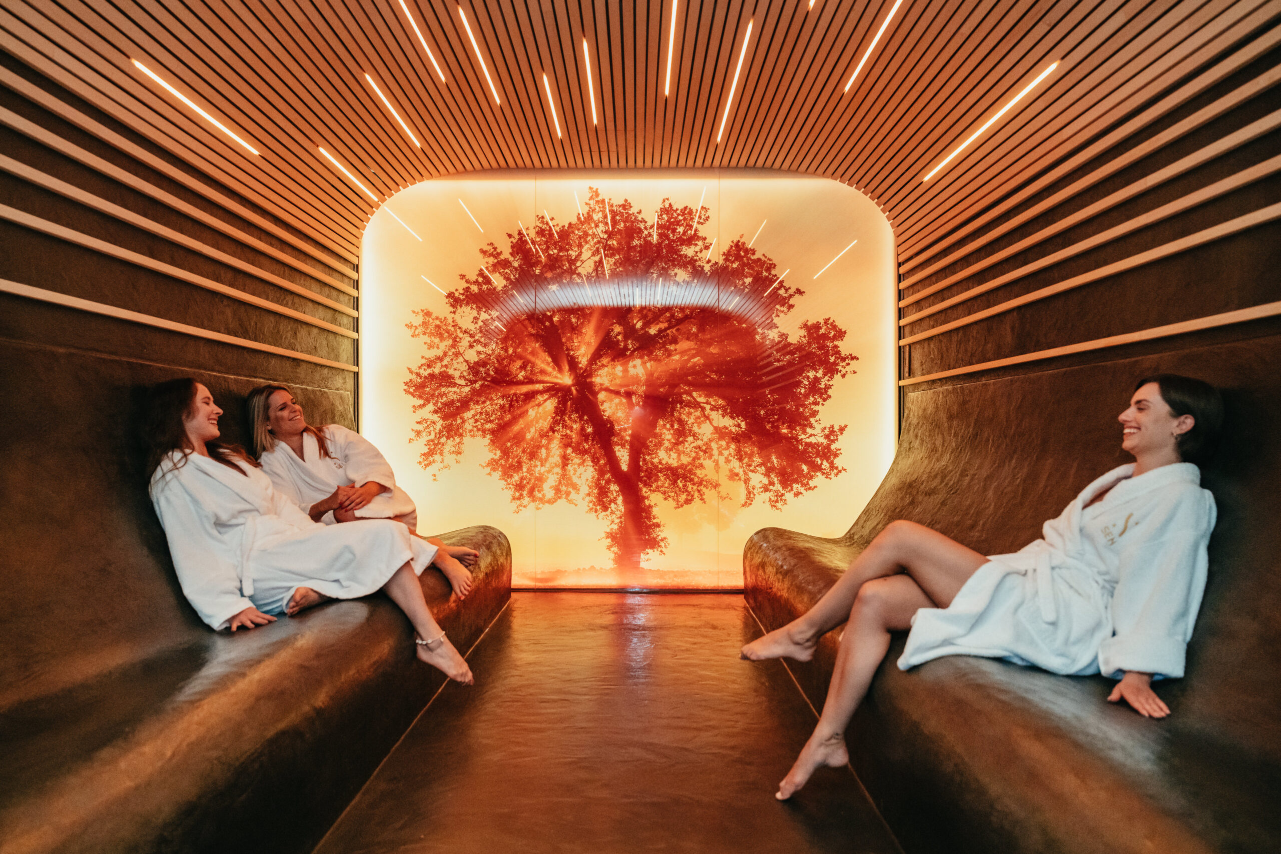Im Raum des Tepidariums pulsiert warmes, sanftmütiges Licht im Rhythmus langsamer Atmung, das Ihnen unbewusst hilft, Ihren Atem und Ihren Geist zu beruhigen. Die Entspannung wird durch das Sitzen auf beheizten Rakelbänken angenehmer. Das Tepidarium zeichnet sich durch eine variable Temperatur aus, die je nach Wetterlage variiert.