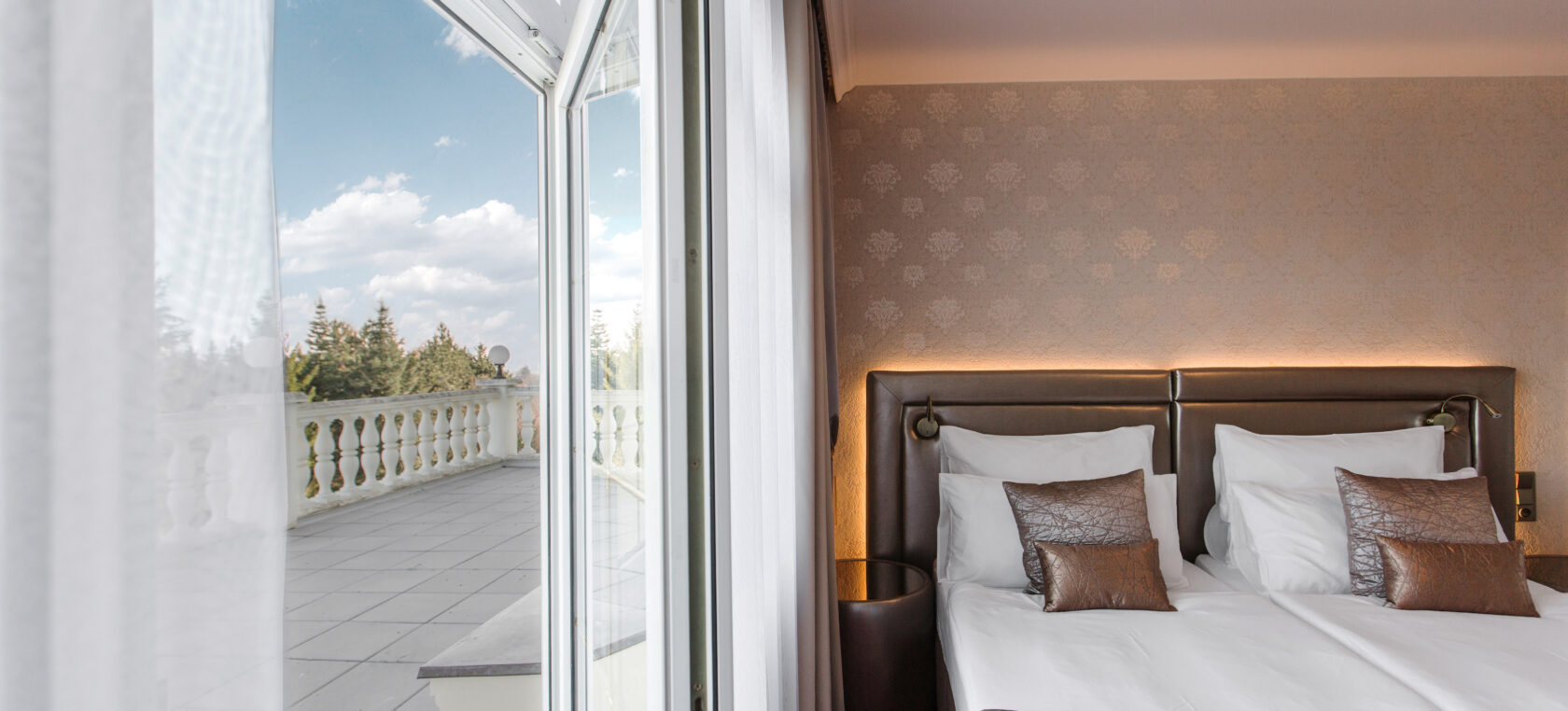 Two romantic Deluxe Plus**** rooms with a terrace and beautiful view of the hotel garden are located on level 2 with an elevator. This rooms can be connected one with another, creating a comfortable space for a family or a group of friends.