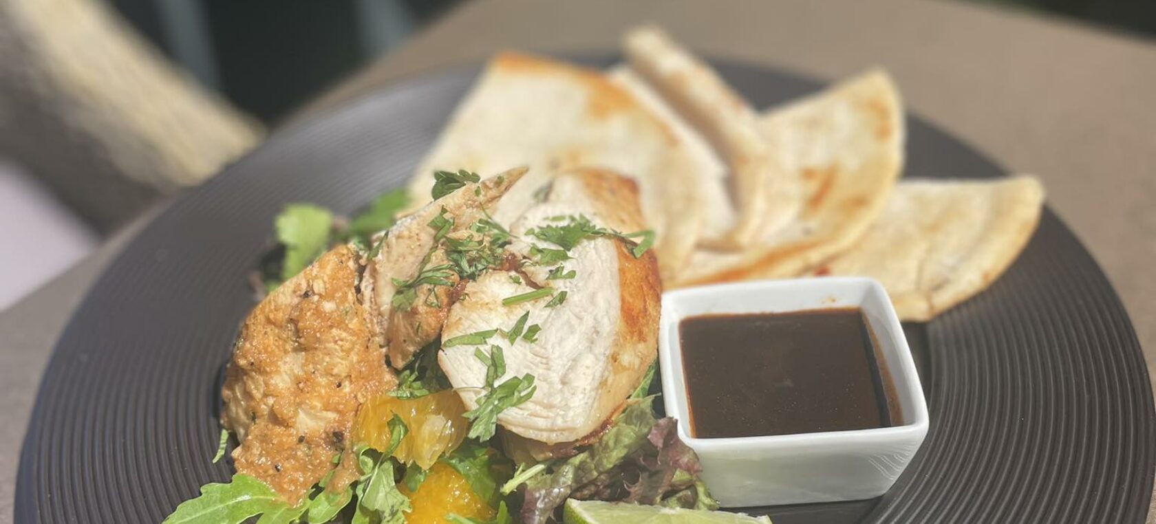 Grilované jamajské kuře opečený pita chleba, rukolový salát