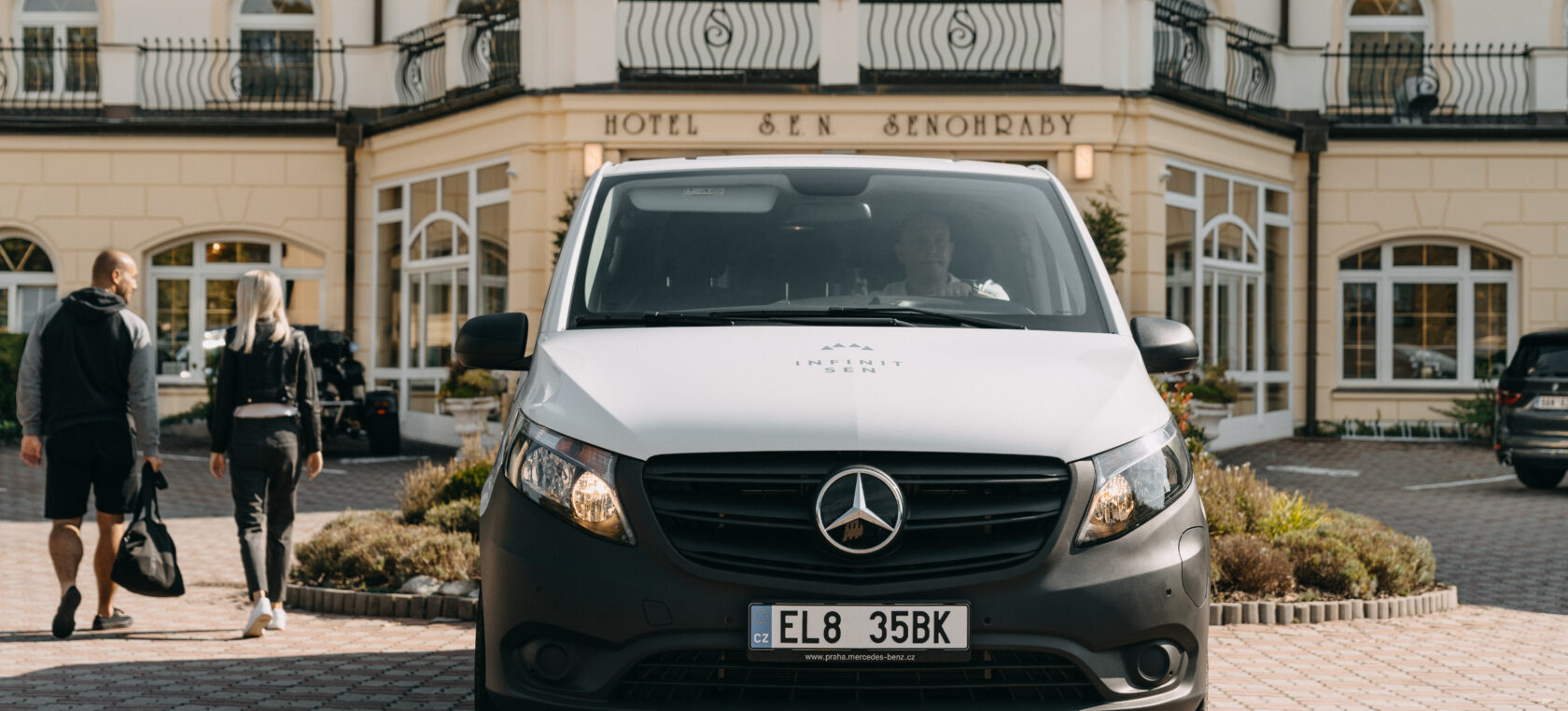 Plně elektrický shuttle bus Mercedes eVito a minibus MAN bude jezdit kyvadlově každý den dle jízdního řádu. Během 5 minutové komfortní jízdy vás zdarma odvezeme z nádraží Senohraby přímo před hotel Sen a poté na zpět na vlak.