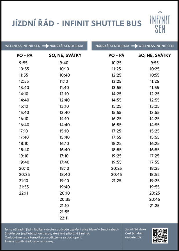 Náš shuttle bus Vás přímo od hotelu přiveze na vlakové nádraží v Senohrabech na každý odjezd vlaku do Prahy či Benešova. Stejně tak vás vyzvedne při každém příjezdu vlaků zpět do Senohrab a přiveze přímo k hotelu.