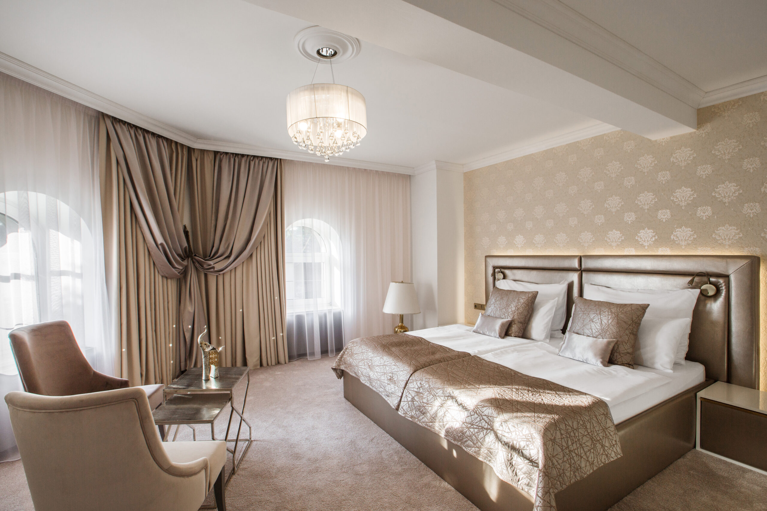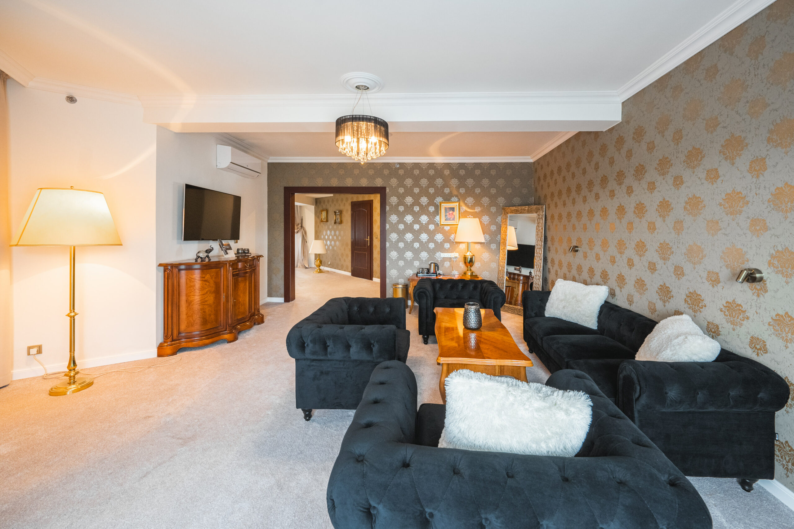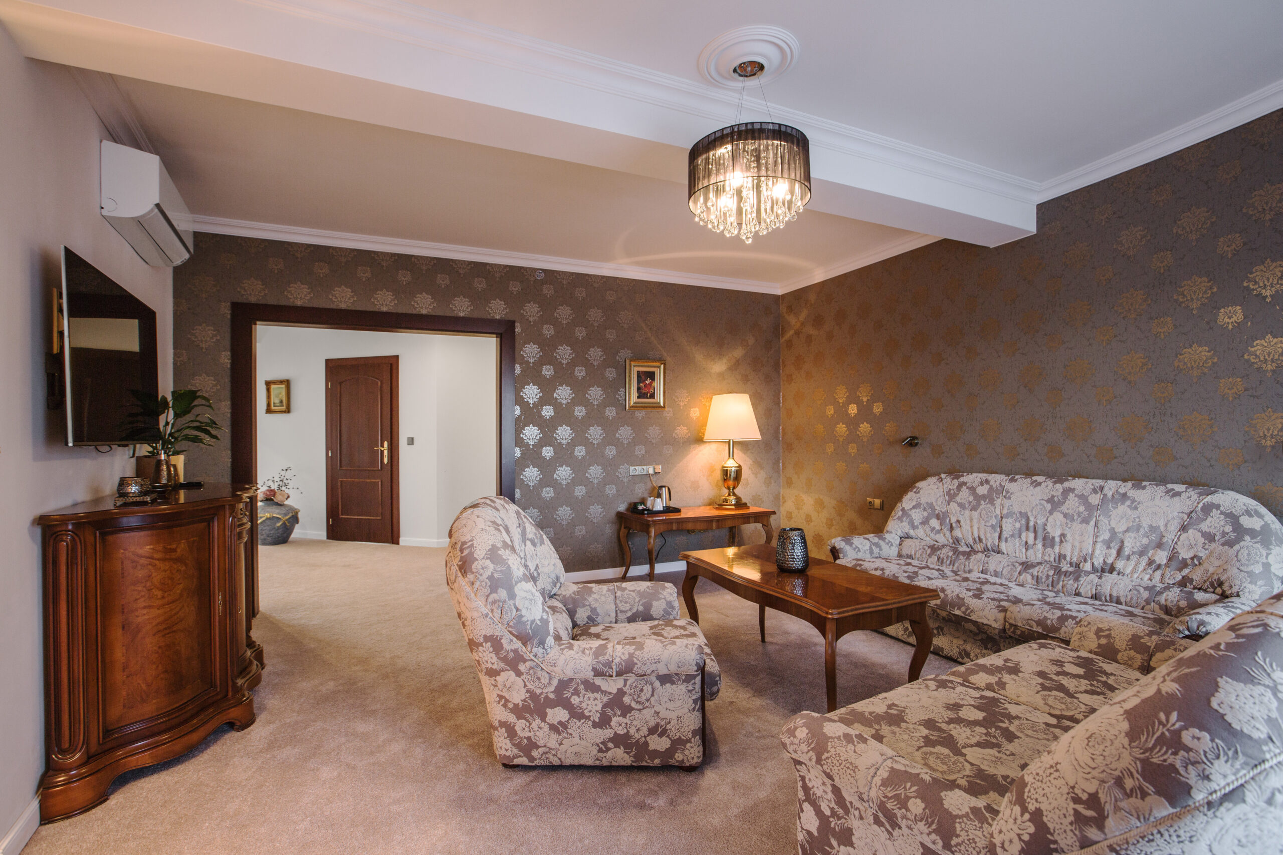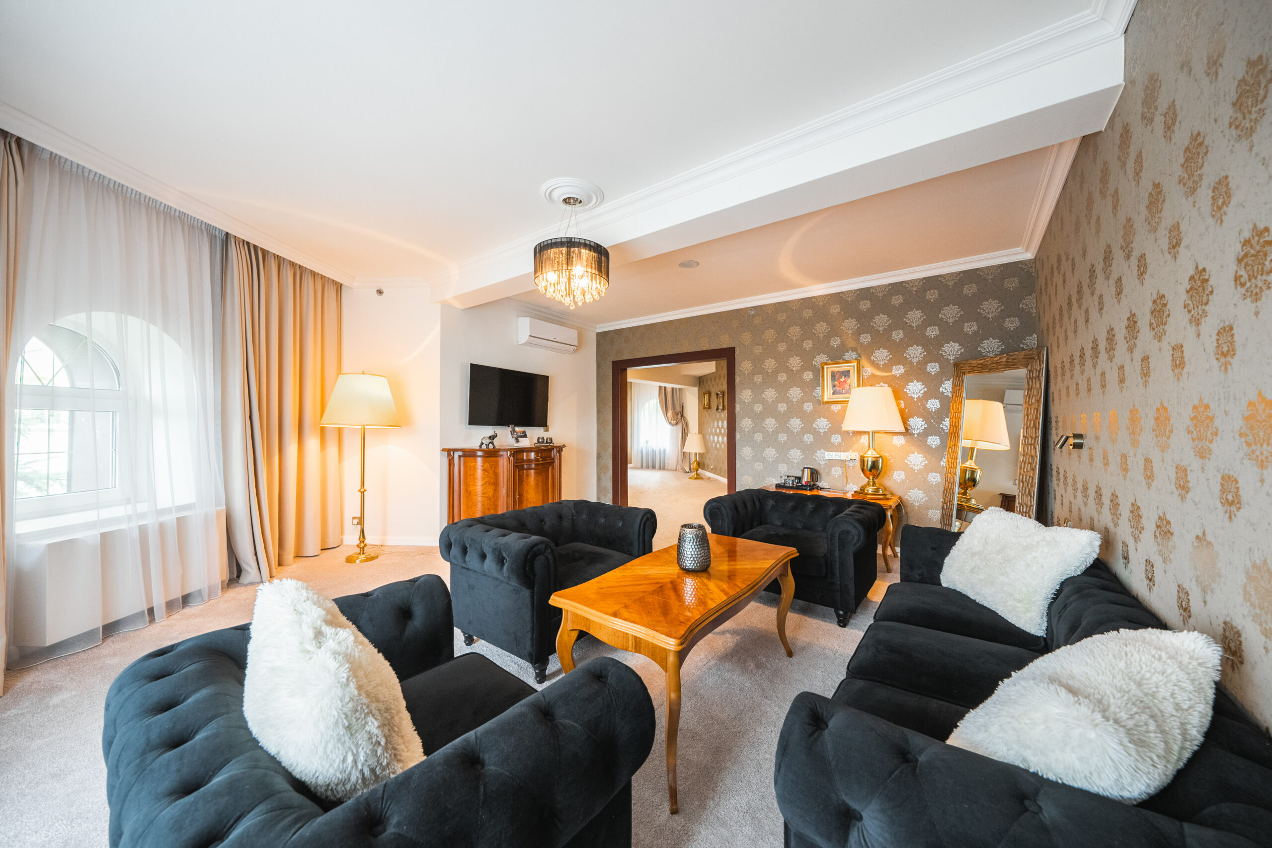 Zámecké apartmá poskytuje romantické prostory s ložnicí, obývacím pokojem se sedací soupravou, šatnou, koupelnou se sprchou a vanou, odděleným WC a prostornou vstupní halou.